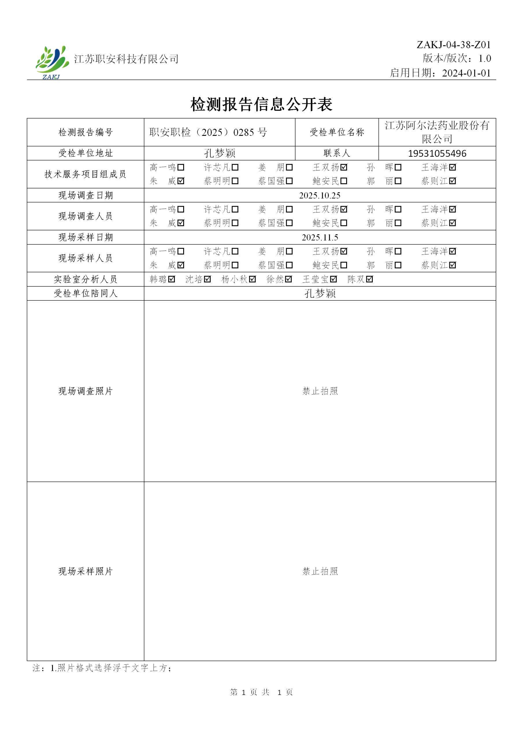 检测报告编号 职安职检(2025)0285号
